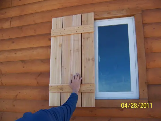 Lewis Allen used cedar fence slats to make shutters for his garage. His photos show the garage without shutters, one of him holding up a shutter to the garage window and finally, the finished project.