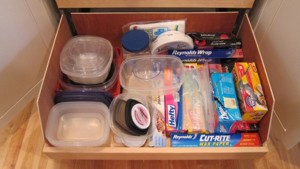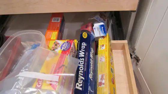 I had a pesky problem with pull-out drawers in my pantry. Wrapping supplies and food-storage containers would slide off the low drawer and fall behind it inside the pantry. You had to get on your hands and knees to go fishing for them. What a pain in the you-know-what!