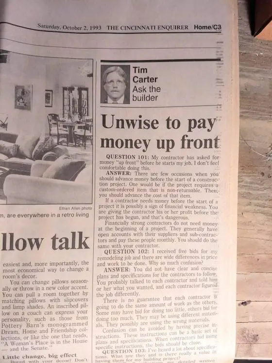 I wanted to see my first Ask the Builder column in print. I was alone and everyone else was asleep at the house as I came inside and opened the paper.