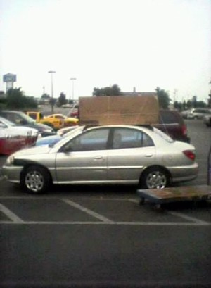 "It shows what can be done by a determined DIY individual. The box on the top of the 2002 Kia Rio contains ... the fiberglass bathtub for the basement. It was transported 3 miles, without incident using the nylon twine freely given out by Lowes. Now ... there was a helluva lot of twine tied with good Boy Scout knots in six different directions taking into account wind forces, uplift, and poor roads, but twine nonetheless (it really is pretty strong!).