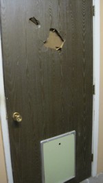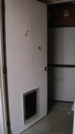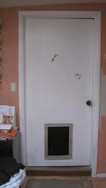 This door used to be an outside door in which the previous homeowners installed a doggie door (we don't own a dog). Behind the door is a 7ft x 15ft room which is the laundry room and storage. Getting items in and out of the room is troublesome since the door takes up nearly half the width of the room when opened. It's hollow core and has unfortunately encountered a couple of mishaps where items piled in the laundry room fell on it and a family member tripped against it, resulting in holes in the door which I cannot repair. It's not only unsightly, but guests always think it's an exit door. A pocket door would solve the problem of space and guests would not try to exit into my embarrassing laundry room!