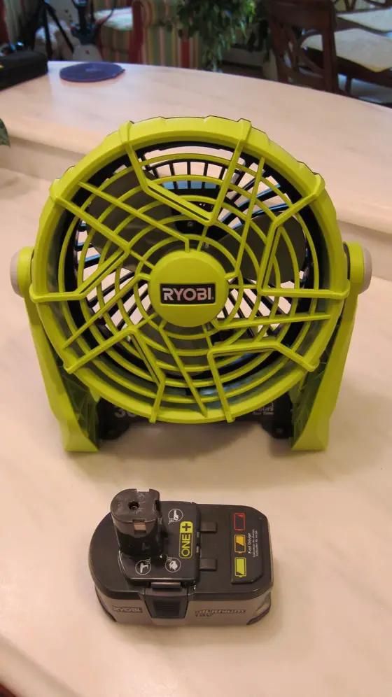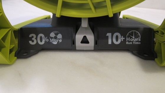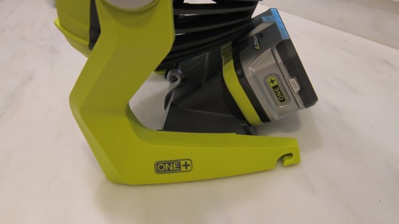 The 18-volt battery is installed in the back of the fan. This location gives the fan great stability with a low center of gravity.