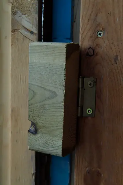 Picture 2: For you to go in and out of the shed. If you want to keep it open, you can always attach a 'hasp and staple' type of hatch to the wood or just use a 'hatch and staple' latch by itself."