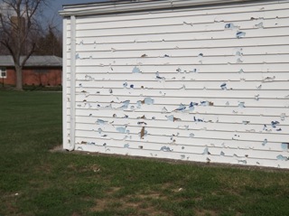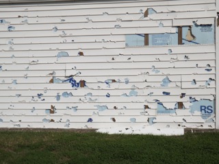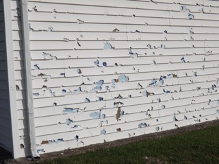Our back garage has vinyl siding, and it has to have a new back and two lights replaced. My gazing ball and solar light were damaged, as well as crawlspace vent covers, etc. But if you drove by, you would think we had no damage.
