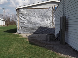 Here is a start of some hail damage pictures. These pictures are of my nephew's garage. The one with the tarp is his double-wide trailer. Probably a good third of our town has this much damage. We live about a mile from him.